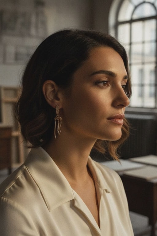 "Inspirées par la trajectoire des étoiles filantes au-dessus des toits de Paris. Ces boucles d'oreilles capturent l'instant précis où la lumière rencontre le mouvement. Le cercle parfait symbolise l'éternité, tandis que les lignes tombantes racontent une cascade de diamants célestes. Un bijou pour celle qui porte sa propre lumière, même dans l'obscurité la plus totale."