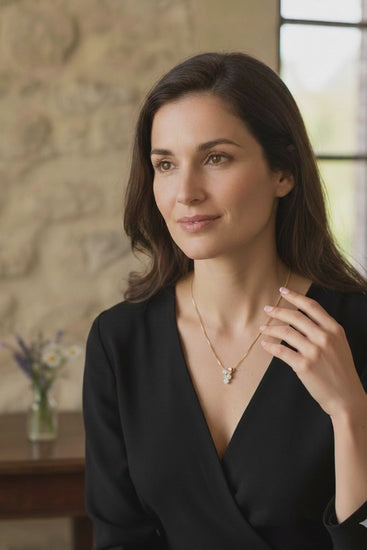 Cinq gouttes de rosée pétrifiées dans la lumière. Quatre cercles parfaits guident le regard vers une larme de cristal finale, créant une géométrie sacrée à même la peau. Ce collier est une ode à l'équilibre et à la clarté. Forgé pour durer, il vous accompagnera du café du matin jusqu'aux soirées les plus prestigieuses, sans jamais perdre de son éclat."